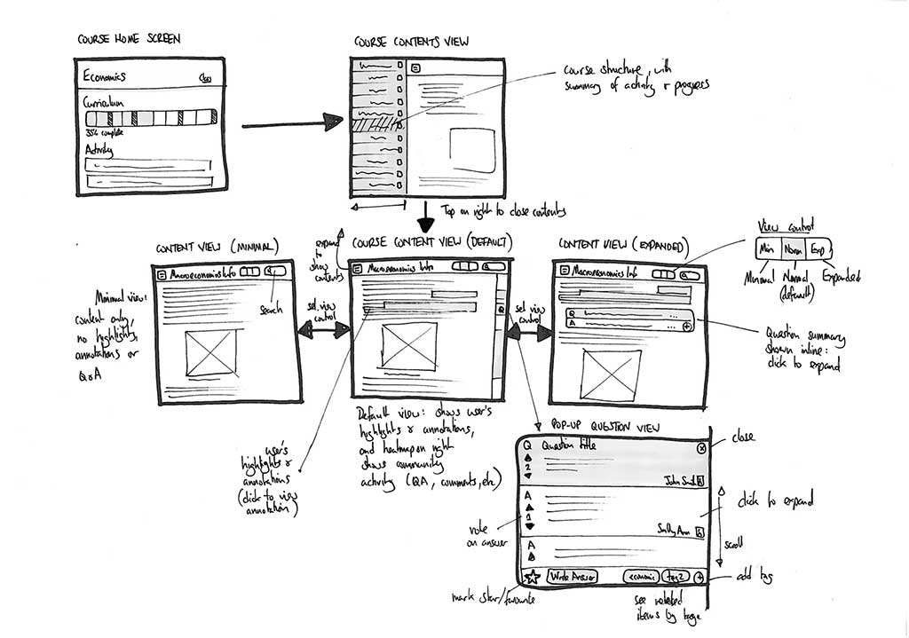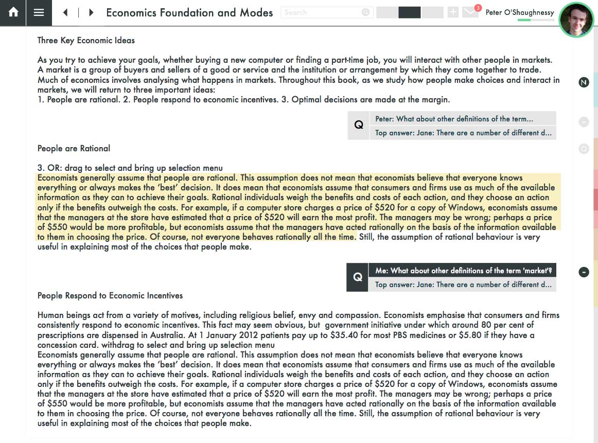 • Students can ask questions to their classmates and teachers right at the point in the text where their question arises, and and can also see previous questions and answers in the same place, revealing another layer of understanding over the core textbook.