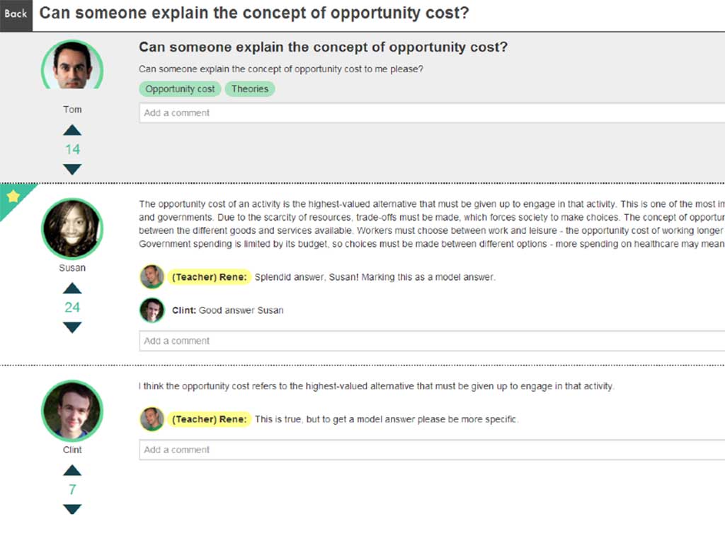 • Teachers can also monitor each students level of participation, by seeing how many questions they are asking, and seeing how their answers are rated by their peers. Visualisations of participation and ratings for student in the class help to give the teacher clear indications of their performance.