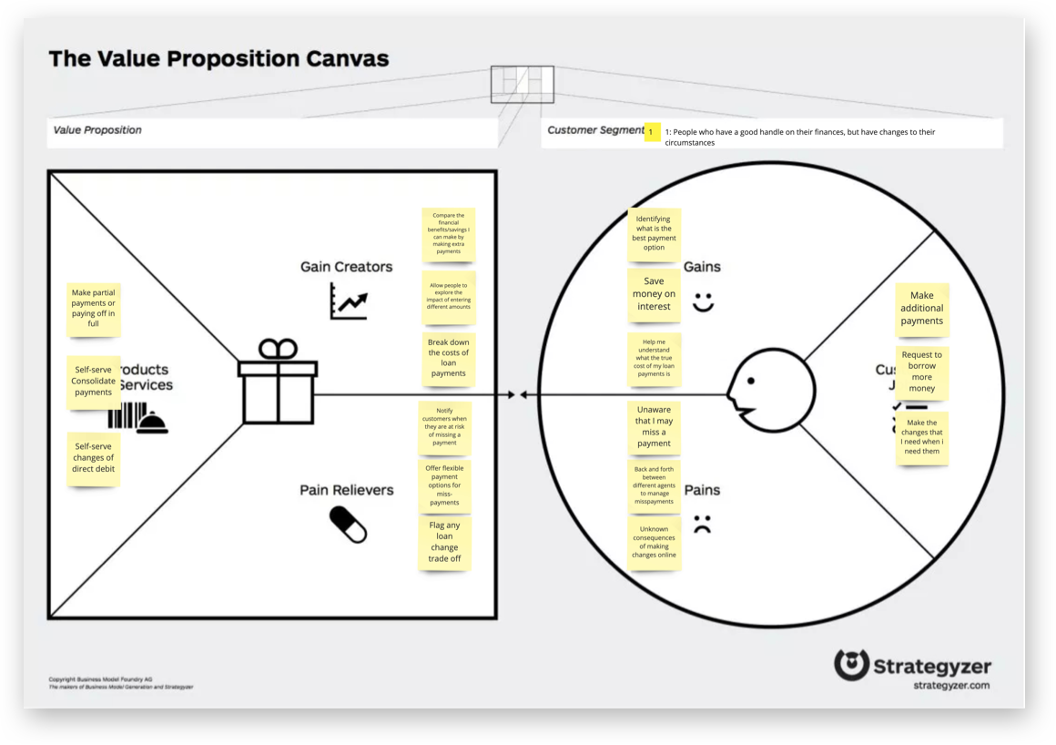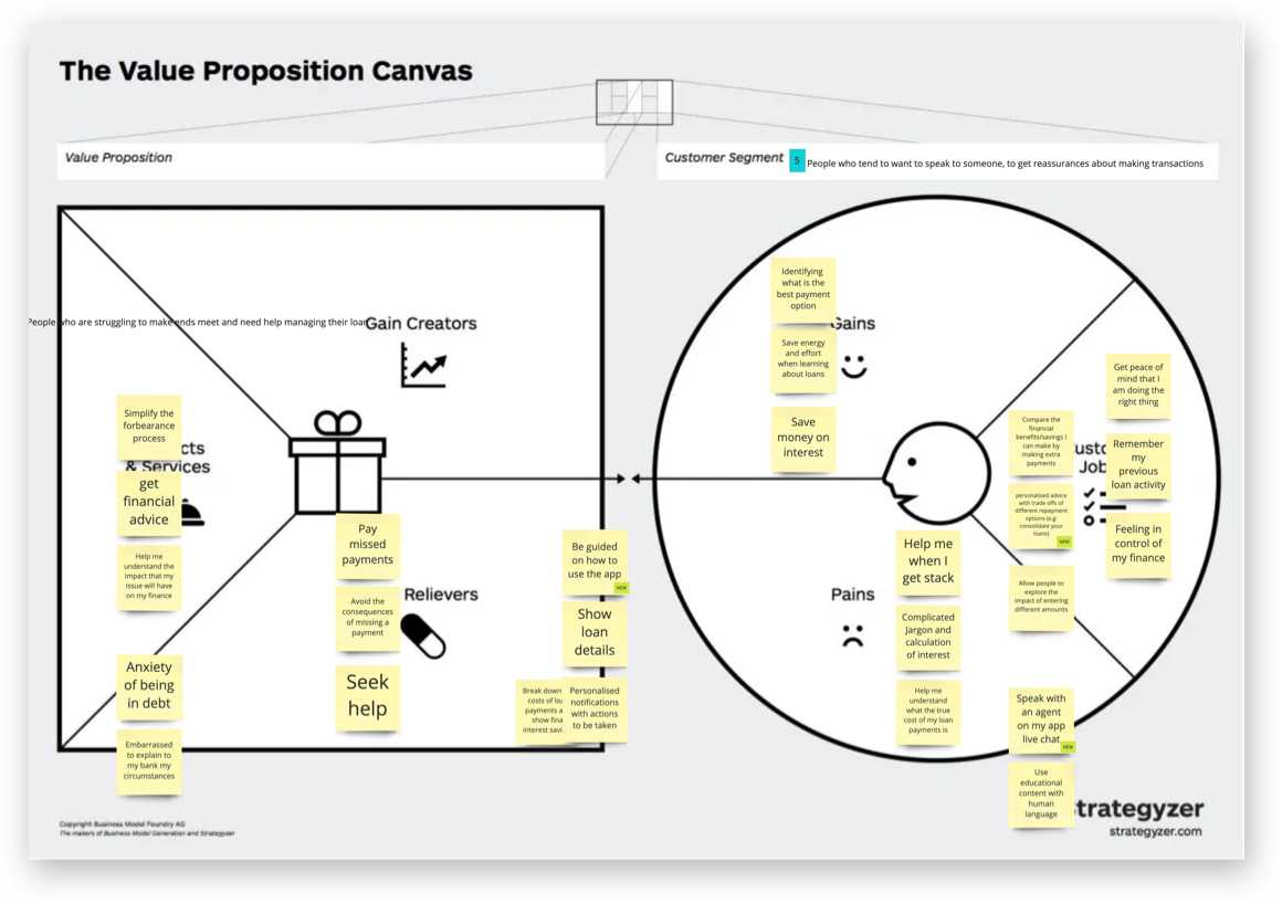 We then built out a value proposition canvas for some hypothetical profiles we built from our findings so far combined with existing customer segment data.